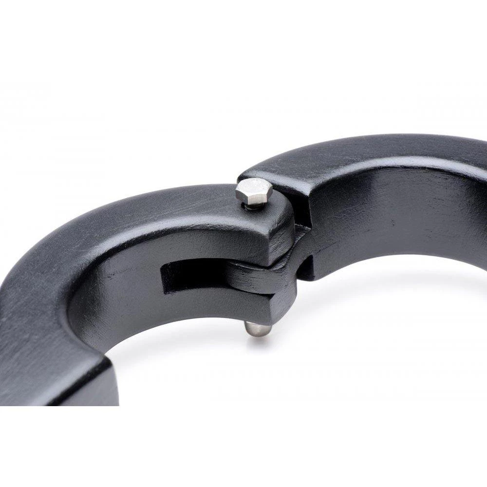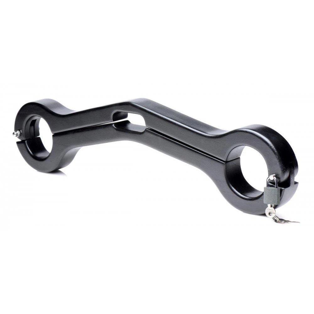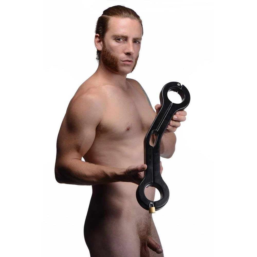 Take advantage of his helplessness by pinching his nipples, teasing his cock, punishing his flesh, and invading that asshole! This wicked device clamps around his scrotum, with his wrists trapped on either side, so that he is forced to accept whatever cruelty you dole out. Even involuntary motions to protect his parts will tug mercilessly on his balls! You’re going to love driving him crazy with desperation, destruction, and desire! This Humbler is designed to be worn in front of the body, with a hing on one side to easily open and close on your boy toy, and a locking clasp on the other side so that he remains your victim until you’re ready to set him free.
