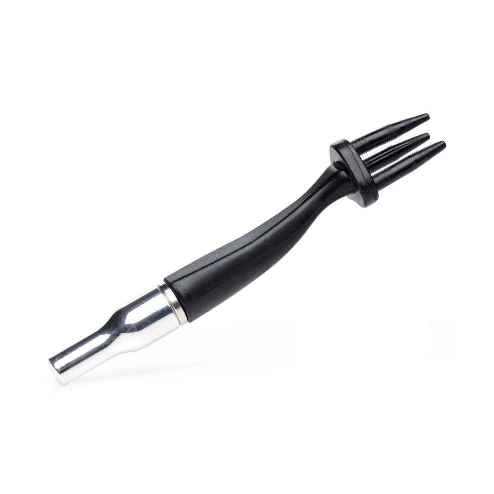 This set of 4 silicone violet wand attachments allows you to experiment with a variety of electrosex sensations without worrying about fragile glass breaking. The mushroom-shaped accessory glides along your flesh, sending focused jolts of current. The unique shape of the silicone comb allows it to transmit 9 pinpoints of electricity into your supple skin. Give into your devilish temptations with the 3 zapping points of the trident accessory as it prods at your prey. Finally, experience the best of both worlds with the long conductive falls of the silicone flogger, a shock in every slap! Unlike glass attachments, the silky-smooth, flexible material withstands rough play with your man, traveling haphazardly in a bag, or whatever dangerous delights you have in mind. Experience new E-stim sensations from the top-quality silicone. Just insert it into the attachment jack on your Violet Wand and find out how much electrosex you can handle!