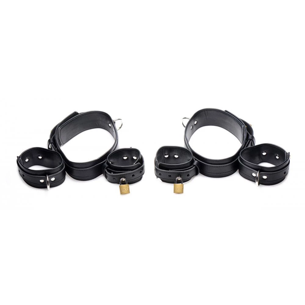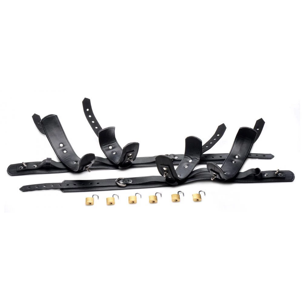 This set of restraints includes 6 locks and 12 keys to pin your man down to his knees until he earns his freedom. Adjust the thigh cuffs, wrist cuffs, and ankle cuffs to you or your partner’s preferred tightness and add a lock to physically and mentally bond them to your authority. Use these restraints in combination with floggers, blindfolds, and other BDSM essentials for a genuine dungeon experience.