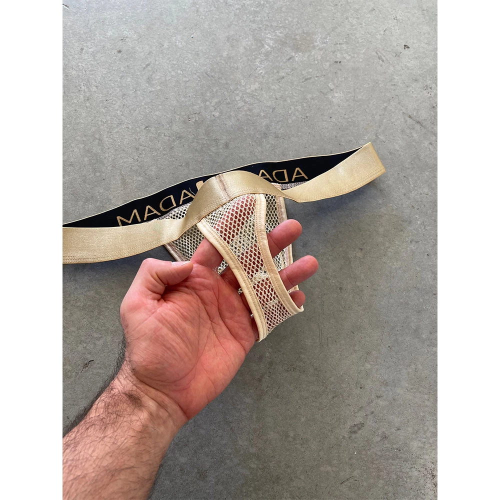 The Adam4Adam Gold Mesh Thong is one of the latest additions to our underwear collection and is a brand new silhouette. The pouch is made in a see-through super sexy gold mesh fabric that reveals your package and the back side reveals your 2 cheeks in a very comfortable thong detail. It also has a gold elastic waistband with a black logo.