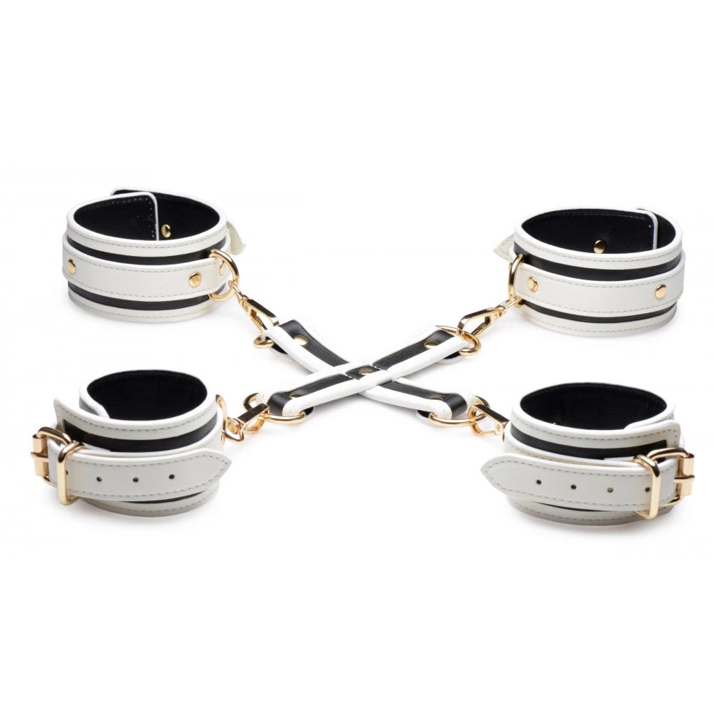 Keywords: glow in the dark, bondage set, wrist and ankle cuffs, leather, hog ties, white, gold
