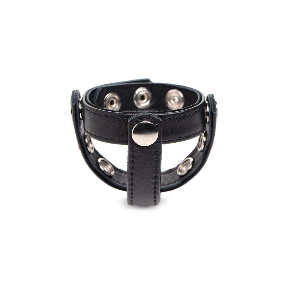 This cock ring is bound to keep you comfortably restricted as you sport a rock hard cock! The leather cock ring keeps you engorged as the middle strap bisects the testicles as a harness for a little extra support and ball stretching! The nickel-free, metal snaps make putting the device on and taking it off easy! Simply press the snaps together firmly to secure it in place or tug at it to free yourself -even when fully engorged!