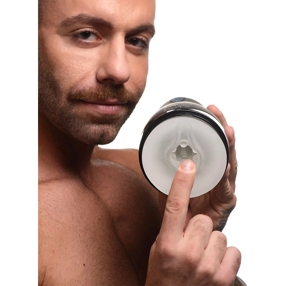 Enjoy this potent mini man milker at home or on the go! Small and discreet, it is travel friendly! The soft and stretchy textured sleeve is realistic and has patterns of nubs on the inside for you to enjoy. Warm it up before you dip your wick by using the heating function that heats not only the toy but any lube squirted inside before use. Choose between 3 speeds and 5 patterns of vibration that rock your cock and enjoy an additional 3 squeezing modes to milk you. The only challenge is fighting back the urge to cum too quick!