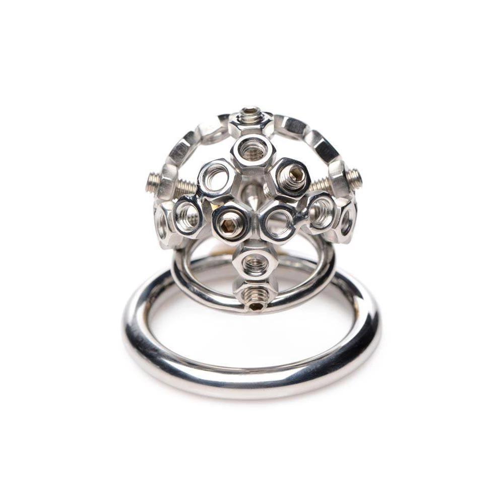 Put that lame little dick in a painful lockdown with this sadistic chastity device. You can do whatever the fuck you want to it… because it’s your property. The tiny cage is made out of dozens of hex nuts and attaches to either the small or large base ring (depending on your mood) with the included padlock. But it gets better… for you at least! There are ten sharp screws around the cage, which can be removed, rearranged, and screwed in deeper with the included allen wrench to enact your wickedest CBT desires. Your slave will be desperate to please you in hopes that you will show some mercy.