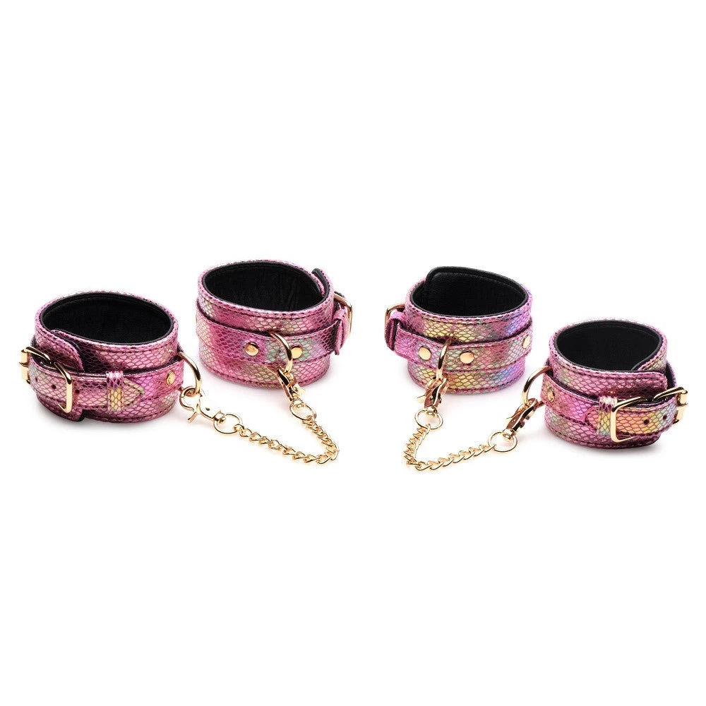 Sure black, red and blue are kinky colors… but what about the boys who want a little something different? This gorgeous snakeskin bondage set has an iridescent rainbow hue that catches the light and brings out the blushing pink of freshly spanked asses or fully flushed cheeks! Paired with the golden chains that connect the cuffs and buckle closures on each cuff, this dazzling set is stylish and yet still strong. Included are two ankle cuffs, two wrist cuffs, and a collar, plus a chain leash and two connecter chains to keep their wrists and ankles together and lead them around! Made of PU leather, it is vegan-friendly and easy to clean. All metal is nickel-free.
