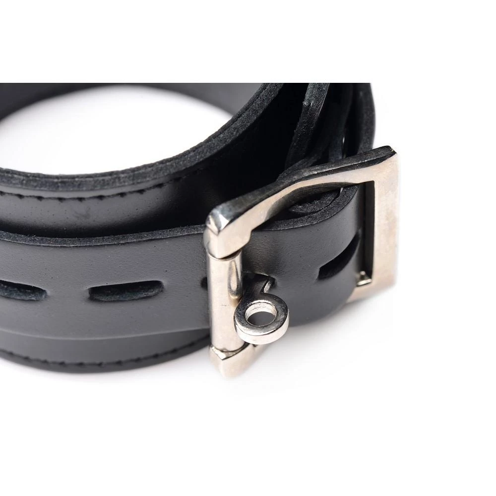 The buckles on the ankle cuffs are designed to accommodate optional locks, not included, to create an even greater sense of helplessness while you have your way with him.