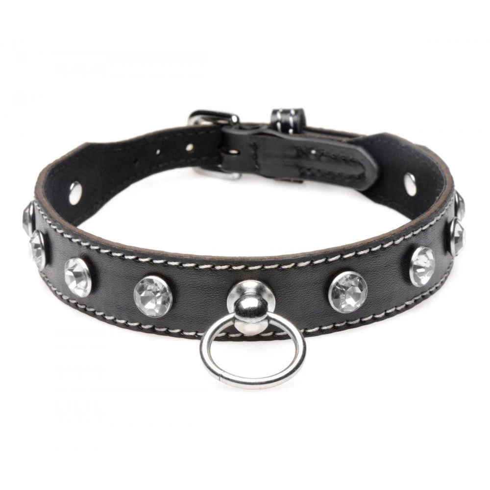 This dazzling, rhinestone collar is a perfect addition to any fabulous outfit and makes a perfect gift for your sub or kinky lover! Beautiful, acrylic rhinestones line the collar strap. The strap is made of PU leather and is easy to clean and take care of. The collar has a metal buckle at the back to adjust for a perfect fit. Use the O-ring at the front to add a leash and lead them around!