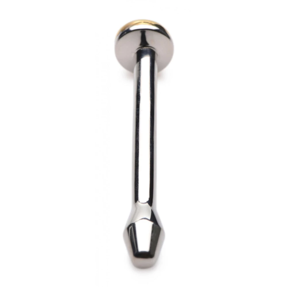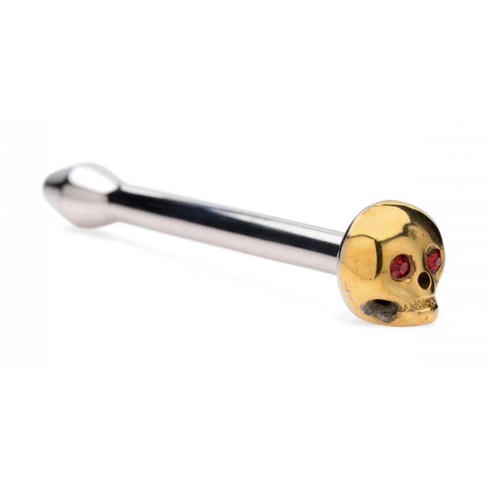 Enjoy an intense urethral fill with this kinky sound! Featuring a bulbous tip for deep hitting prostate stimulation. The brass skull tip features ruby eyes, adding a macabre decoration at the tip of your dick!