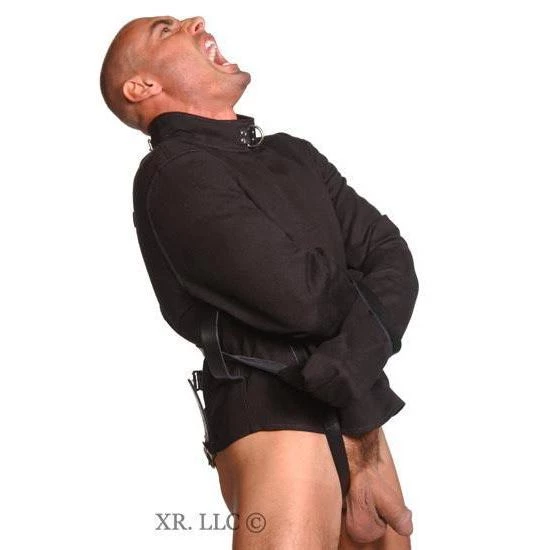 These black canvas straitjackets really stand out from the crowd. This straight jacket is made of high quality soft canvas that is more comfortable than other institutional style straightjackets. This black jacket, with its unique design and rich black color, is one of our more popular styles. It is a functional straightjacket as well as a definite fashion statement. The leather straps are strong and durable. The dual crotch straps are a rare feature that can not be found in most other straight jackets. Dual leg straps keep the wearer from pulling the jacket over the head AND allow access to the crotch. Most straitjackets block access to the genitals. Truely, this is a fine jacket and excellent value.