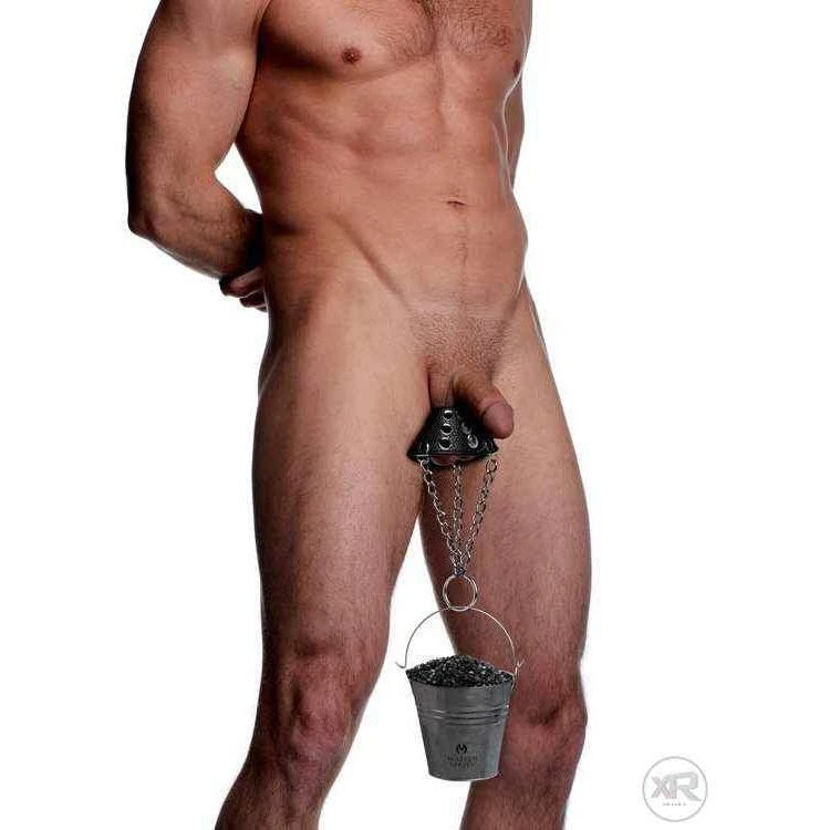 This unique CBT device utilizes a parachute stretcher and a metal Master Series bucket that allows you to use water, stones, coins, or whatever you wish to pull down on your plaything’s sack. Just snap the soft, leather-like parachute around his scrotum (there are two rows of closures to adjust the tightness) and attach the bucket to the three dangling chains. Get creative with the evil things you put your fuck slave through: make him collect tips from all your friends, use him as a spit bucket for your wine tasting… you are only limited by your own wickedness! As an alternative, you can remove the pail and attach a leash to drag him around by his balls.