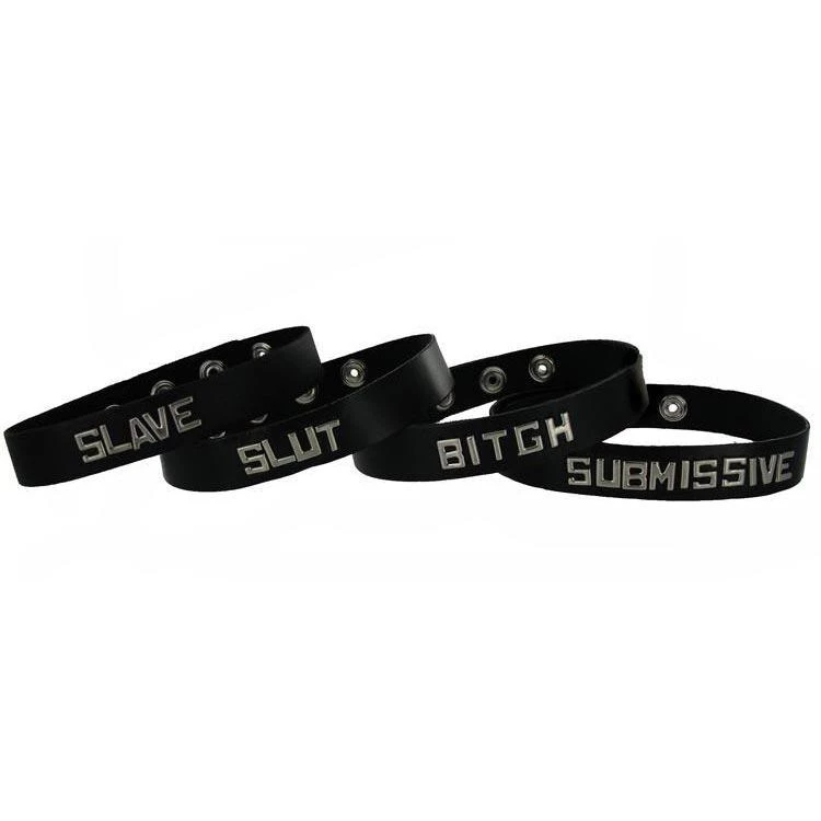 Hot and fun leather identification collars. Made out of 0.75″ wide leather with steel snaps and letters that spell out “Bitch”, “Slave”, “Slut” or “Submissive”.