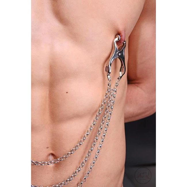These clamps will grip his nipples fiercely. The three chains will add extra weight, so he’ll feel them swinging from his hard nips. They also make it easy to grab ahold of him and give him a yank. You can even hang more from them for more intense tugging.