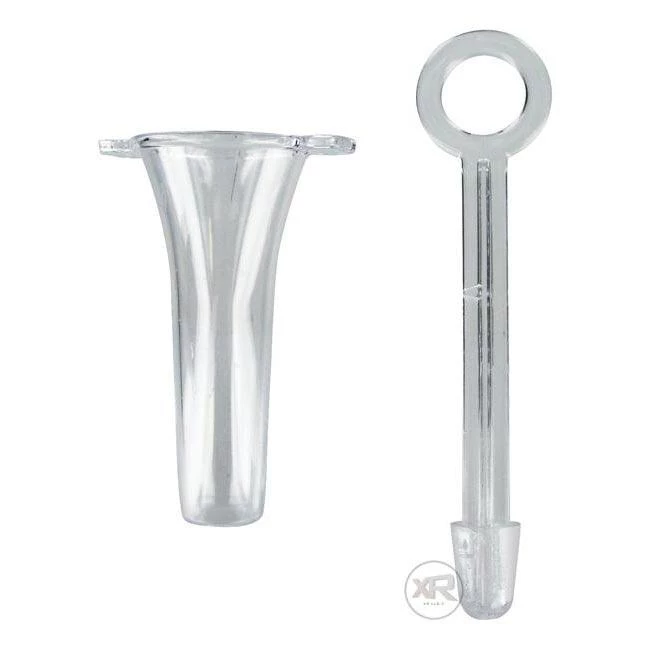 This medical instrument is used to examine the inside of a patients rectum. Once inserted the inner piece with ring tab can be removed to for better visibility during exam. When the inner tab is removed, the outer part resembles a funnel.
