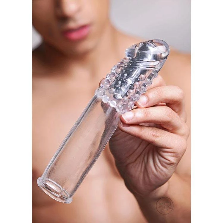 Fuck your partner with the unbelievable size, girth, and texture you can achieve with this Vibrating Penis Enhancer. Providing 3 whole inches of increased penetration, the nubs of on this device will be sliding up and down his hole giving him a pounding that he’ll never forget! This vibrating cock sleeve is designed with both parties in mind, providing vibration deep up in that ass, as well as on the head of your cock.
