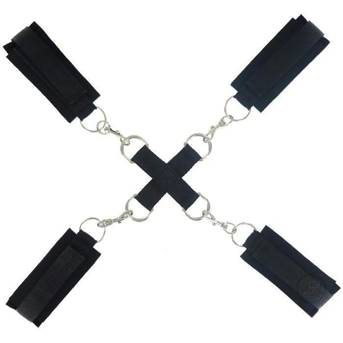 Just fit the nylon and neoprene cuffs tight around his wrists, lay him on his front, and hook the four clips up to the cross restraint piece. You’ll have your partner right where you want him. Other than hog tying your partner, every piece of the kit is easily integrated into other bondage scenarios.