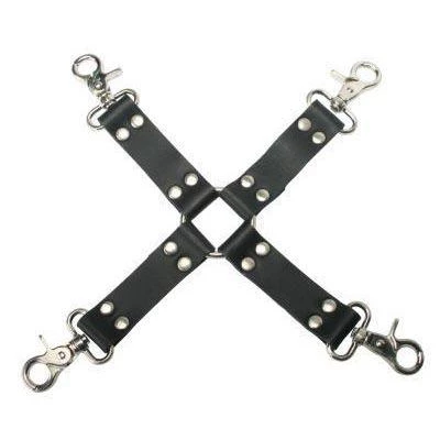 Simple and easy Hog Tie kit. Snap the snaffle hooks onto the D-rings of the cuffs, and you have your sub hog tied!