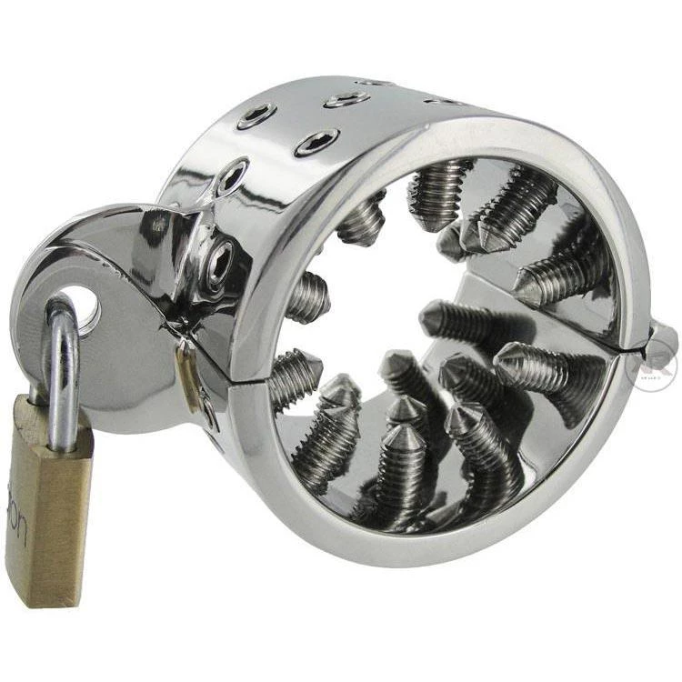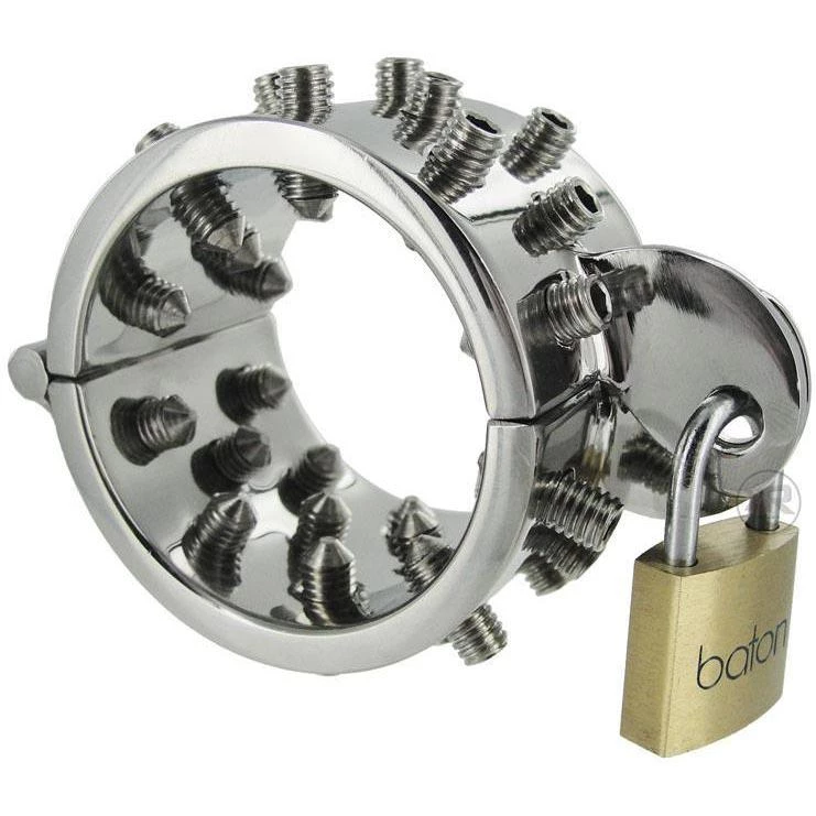 This stainless steel cock cuff has 28 screws, each capable of being fully withdrawn or driven almost half an inch into the ring. Padlock it around your cock, cock and balls, or scrotum, and start adjusting. As you turn the hex key you drive each spike further into your flesh. You choose each point of pressure and how hard you drive it in. You can up the intensity of pressure it puts on you, spike by spike and turn by turn. For added fun, you can even clip ball weights onto it. It’s an intense CBT experience with the kind of adjustability that will keep you trying new things for a long time.
