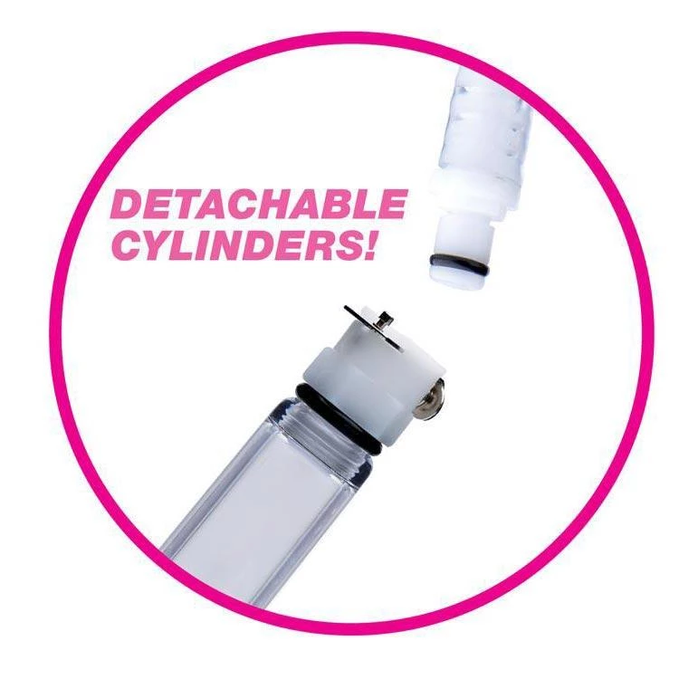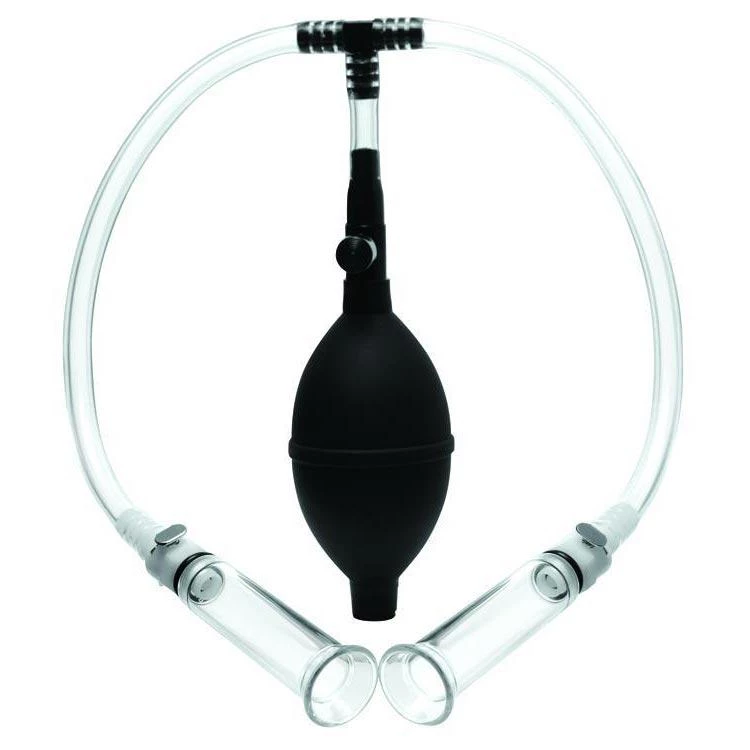 Pump up the pleasure with a dual nipple sucking system! Apply each industrial-grade acrylic cylinder to your pert little nips and squeeze the hand bulb to begin the suction! As pressure takes its toll and circulation increases, your nipples will become rock hard, sensitive, and even temporarily engorged! Just looking at them will make your dick twitch, imagine how it will feel to have them pinched, licked, and sucked! A quick release valve on the bulb makes it easy to release your nipples from the pull of the pump, or you can even remove the tubing from the cylinders, leaving them suctioned onto your sensitive nubs. Take your nipple play up a notch!