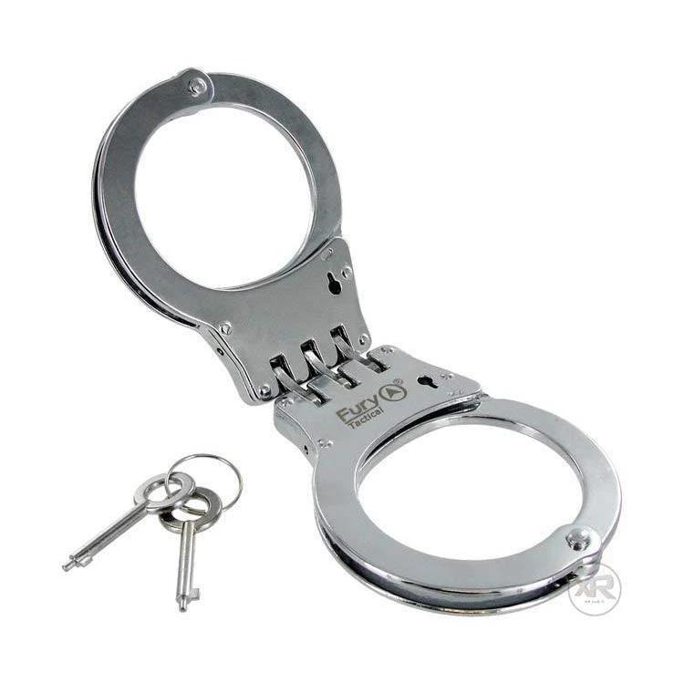 Professional Police double-hinged cuffs made of satin nickel finished steel. The hinge design restricts wrist movement better than standard chain handcuffs.