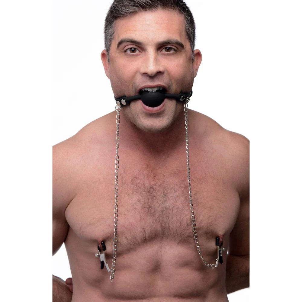He won’t be able to say a word, but you’ll love listening to his muffled moans and groans! Pinch down on his little nipples with the vinyl-tipped clamps, adjusting them to your desired tightness. How much do you think he can handle? Make sure the ball gag is tightened around his head, and even lock the buckle if you want, to ensure that he has no escape from your sadistic torment. With his mouth stuffed full, he’ll be completely at your mercy!