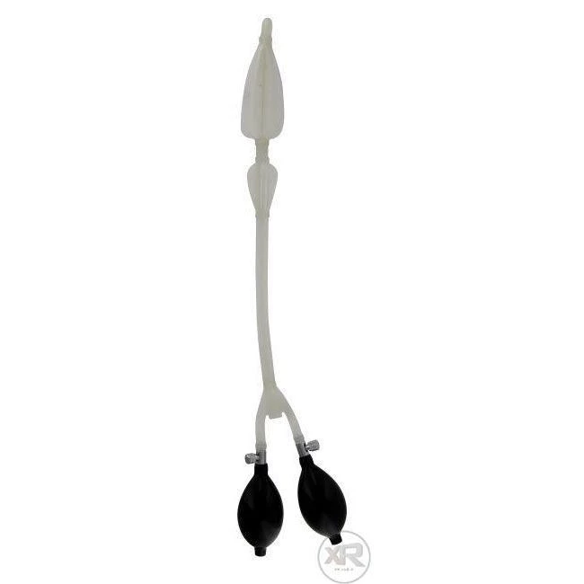The Double Balloon Enema Nozzle is designed to help you and your partner discover the joys and sensations of enema play. With it, you can fill up like never before. The nozzle is inserted along with one of the balloons. Both balloons are then inflated creating both an internal and external seal. Once the seal is created, you can introduce large quantities of liquid into the rectum (up to 3500ml). The larger bulb holds up to 750 CCs of air, the smaller up to 250.