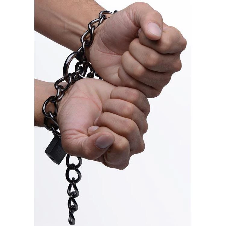 Wrap his wrists in cool, unrelenting metal restraints. Your bitch boy is all yours to play with, but make sure it’s on your terms! He’ll be begging to suck your cock, get fucked, or even just touch you, but he won’t be able to do anything with his hands chained up! Wind the thick links around his ankles or wrists and tighten through the center ring. Lock it in place with the included Tom of Finland lock to ensure that he’s trapped and at your mercy! Alternately, you can use this bondage device as a collar to reinforce your ownership of him.